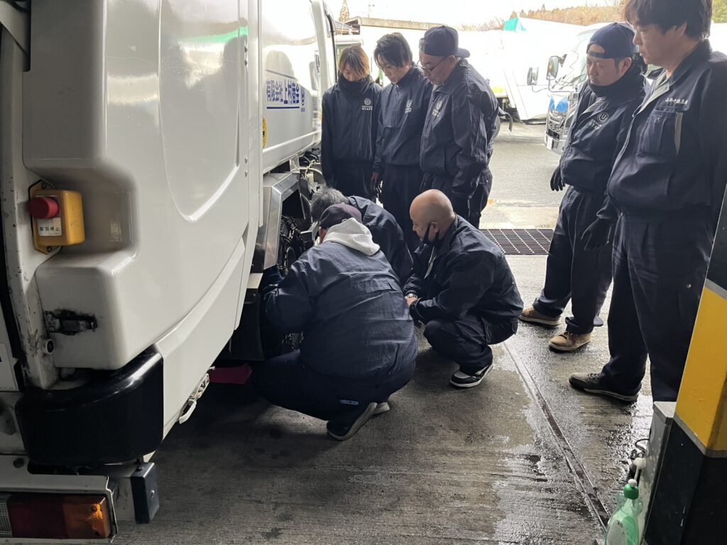 積雪のためのチェーン講習を社内で実施いたしました その後、鏡開きを行いぜんざいをいただきました